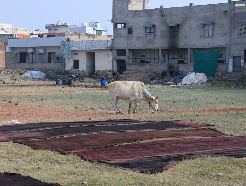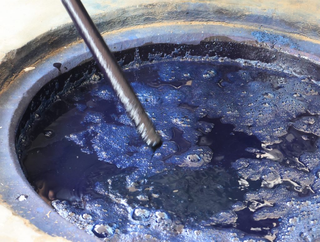 インド・ラジャスタン地方の染め瓶(math)は、深さ約10〜15フィート(2〜4.5m)の深い穴のような構造をしています。染料を建てる際のレシピは、インディゴ、石灰、サトウキビ(ジャグリー)が主成分で、加熱しながら約3ヶ月という長い時間をかけて発酵させます。底には大量のインディゴを溜めておくことで、染色の効率を高めています。これほど深い瓶にするのは、地表の昼夜の温度差(10度以上)の影響を避け、染液の温度を安定させるためでもあります。