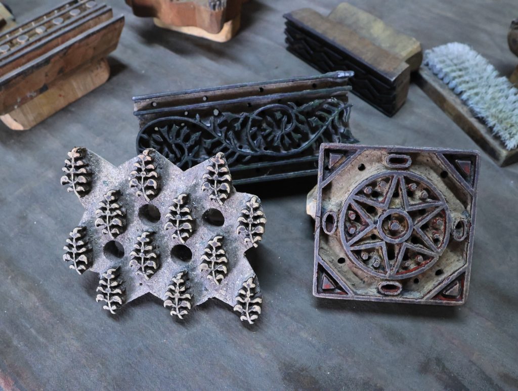 木版。長細いものは縁取り用、四角いものはメインの柄用。植物染めの操作において、木版の構造には組み合わせの妙がある