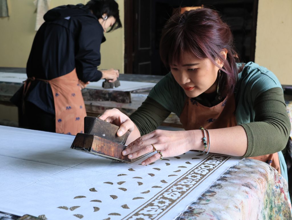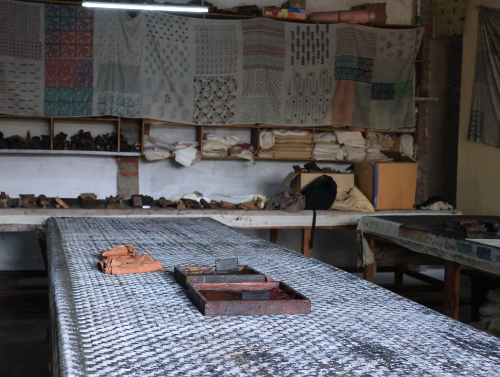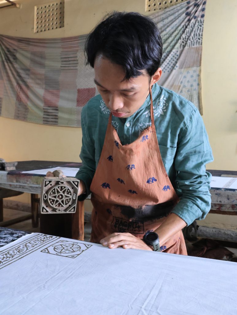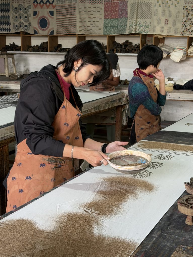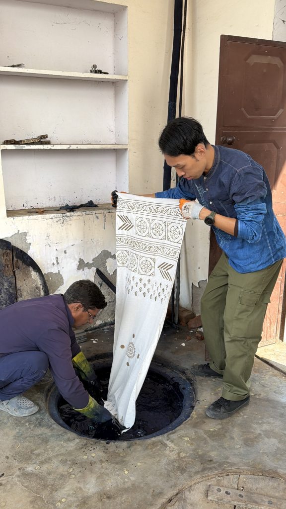 今回、私たちは「ダブ(Dabu)」と呼ばれる泥防染技法を体験しました。「ダブ」という言葉は、ヒンディー語で「押す」を意味する「dabana」に由来し、木版(ウッドブロック)を使って泥を布に押し当てる動作を反映しています。乾燥した気候のラジャスタン地方では、きめ細かく粘り気のある土壌が広がり、それが自然と染色の道具として利用されるようになりました。この技術の歴史は、少なくとも16世紀まで遡ることができます。