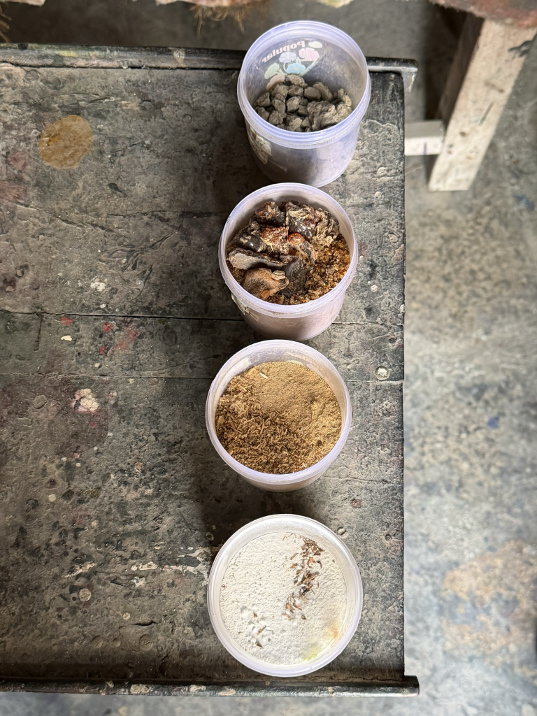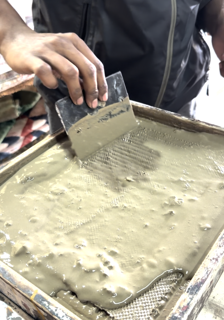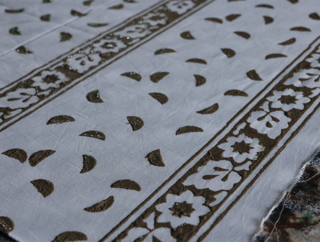 泥防染の糊(防染糊)のレシピは工房ごとに異なりますが、基本的には黒粘土(Kali Mitti)、石灰、アラビアゴム、そして発酵させた小麦粉が含まれています。これらを混ぜ合わせて安定したペースト状にし、木版で布に転写した後、粉末を振りかけて吸着させます。その後、屋外で太陽の光に当てて乾燥させます。