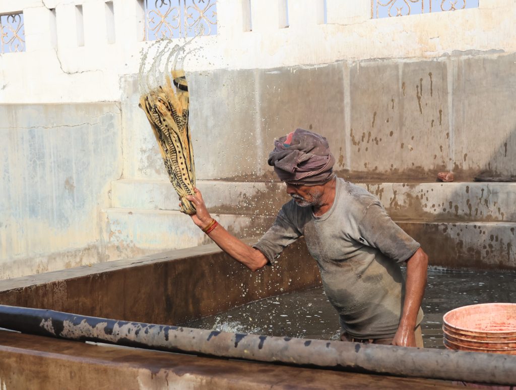 染色後の洗浄工程も非常に独特です。日本の米糊防染は軽くこするだけで糊が落ちますが、インドの泥防染はまず水に浸けて糊をふやかし、その後、布を地面や石に叩きつけるようにして泥を剥ぎ取ります。この工程は「洗い子」と呼ばれる専任の職人が行います。叩きつける技術と体力もまた、一つの専門職なのです。