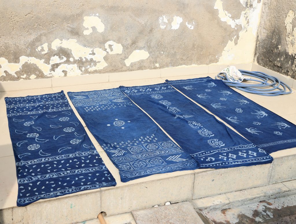 乾燥した泥糊は非常に硬くなり、その状態で藍染を施します。興味深いのは、一度染めるごとにすぐに屋外で天日干しをすることです。これは防染糊が溶け出すのを防ぐためだと思われますが、強烈な日差しのおかげで短時間で乾き、再び重ね染めを行うことができます。この工程を3回ほど繰り返すことで、ようやく染め上がります。