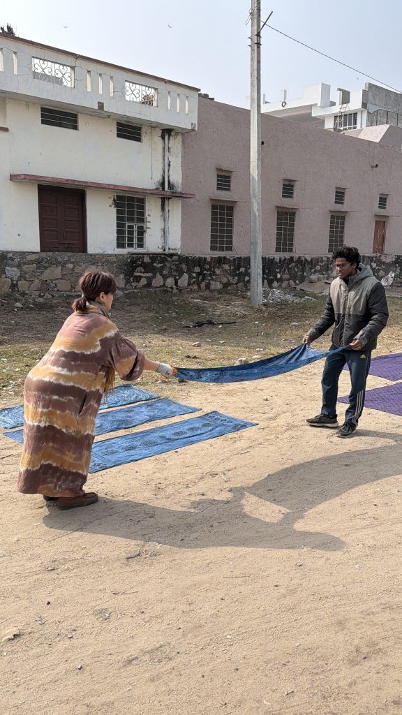 染色後はすぐに天日干しにして糊を再び硬化させ、重ね染めを繰り返す。右側に写っているのが解説をしてくれたYash
