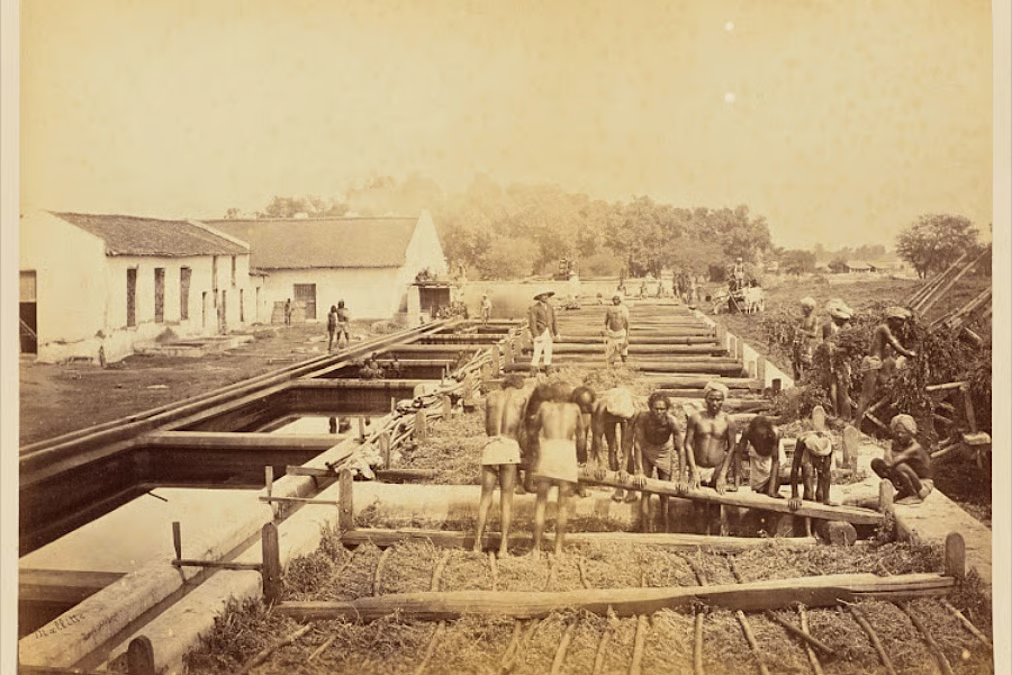 イギリス領インド時代のインディゴ製造工場。人力で木藍を踏み、発酵させている様子