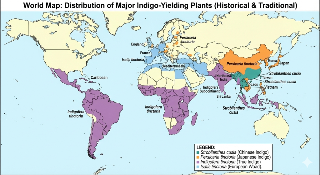 藍染植物の品種分布。紫色の木藍はインドを起源として中南米やアフリカへ伝わった)